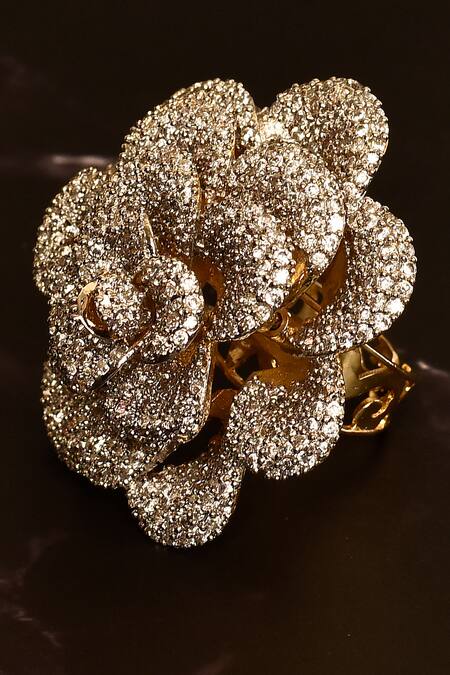 Gold toned ring with rose cut work design & white American diamonds embellishment.