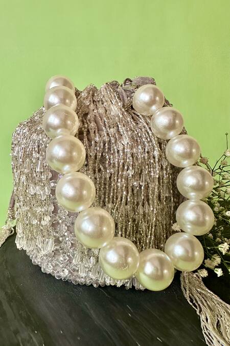 Silver bucket bag featuring ritzy jewel and crystal embellishments. Includes a round pearl embellished detachable handle.