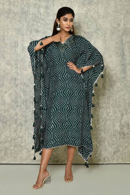 Green bandhini printed kaftan with mirror work on bodice.