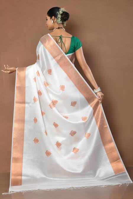 White saree featuring contrast zari woven leaf patterns and a fringed hem palla. Paired with a running blouse made from silk blend.