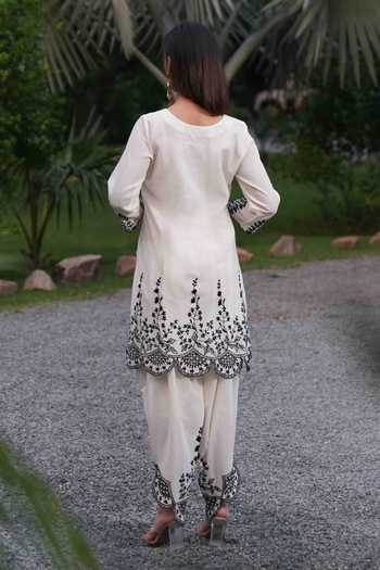 White kurta featuring scallop trim, V neckline, and three quarter sleeves with floral thread embroidery. Paired with matching pant showcasing embroidered hemline.