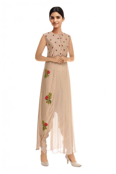 Earthy tones meet modern designs in this asymmetric hem hand embroidered kurta teamed with dhoti pants. High pony and dainty danglers will complete this beautiful look to a T.