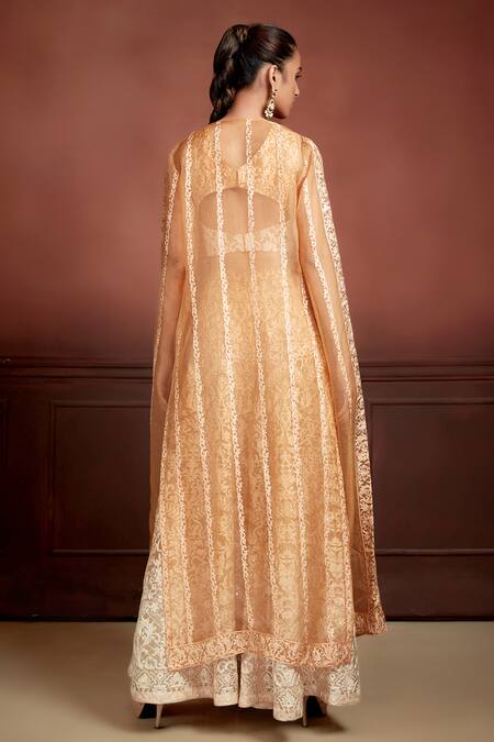 Honey beige shade padded sleeveless blouse with intricate resham work. Comes with ombre shaded flared pant and a pull over cape jacket.