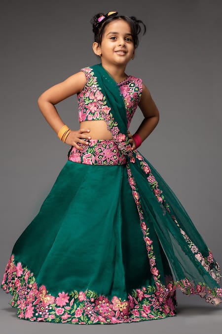 Emerald green lehenga featuring floral embroidery and cutwork hem. Paired with an embroidered round neckline blouse and a net dupatta.