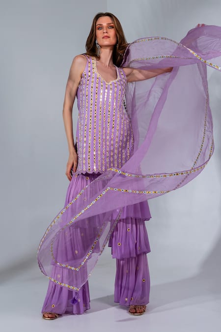 Lilac embroidered kurta featuring mirror, thread, and sequin work. Paired with a sharara and embroidered organza dupatta.