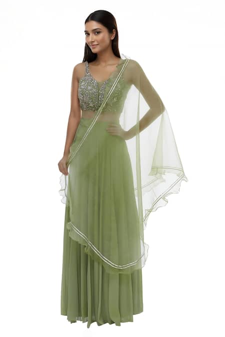 Green Tulle, Chiffon Organza Floral Jaal Motif Leaf Flared Lehenga Set