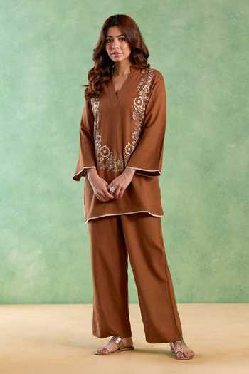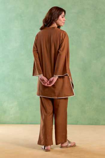 Earthy and refined, the Brown Bloom Embroidered Handloom Linen Co-ord Set showcases subtle bloom embroidery on airy handloom linen. Designed for comfort and style, the coordinated set creates a sophisticated look ideal for casual gatherings and warm-weather days.