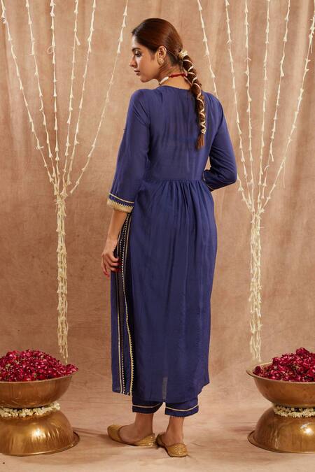 Blue kurta featuring sequin embroidery and lace work on the neckline. Paired with a narrow pant, it includes front pleats and side slits.