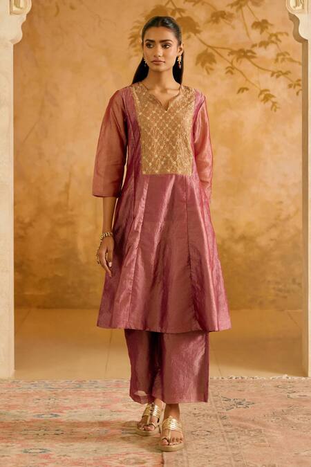 Purple straight kurta featuring a v-neckline and three-quarter sleeves. Paired with matching pants in crush tissue fabric.