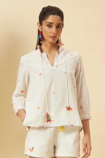 Multi Color Cotton Embroidery, Tassels Split V-neck Ivory Tie Up Shirt Top