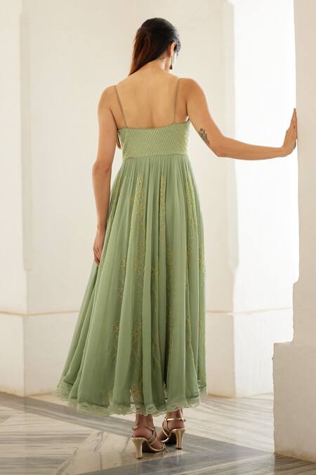 Sage green georgette dress featuring padded spaghetti straps and hand embroidered salli and tikki work