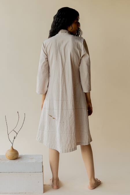 Beige Handloom Cotton Beads V-neck Tesu A-line Dress