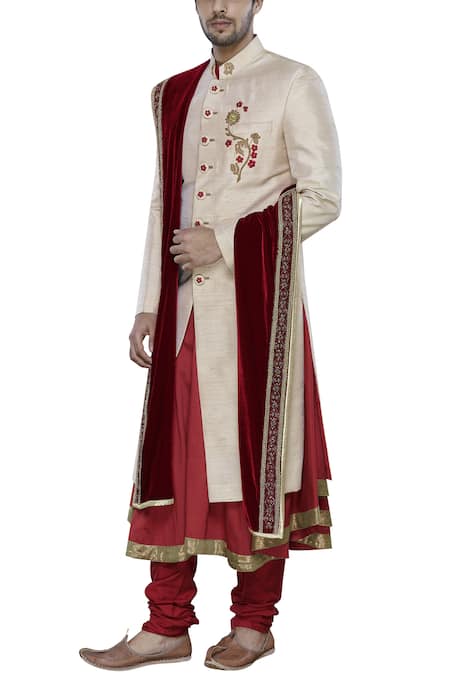 Beige sherwani with placement floral motif work. Paired with brick red flared kurta & plain churidar. This set comes with embellished stole.