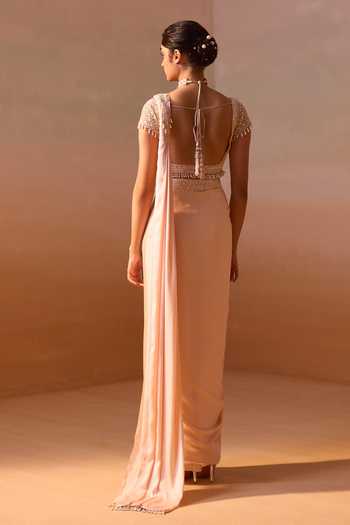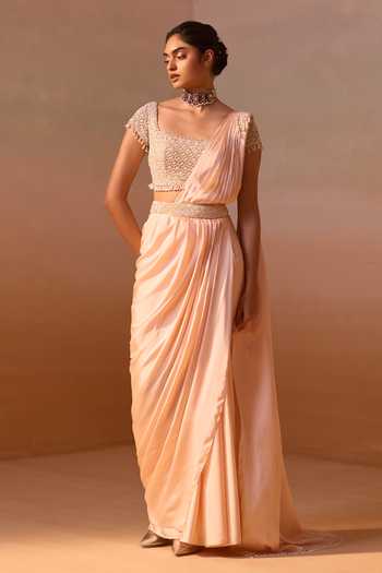 Peach satin pre-draped saree with an embroidered blouse featuring resham and sequins.