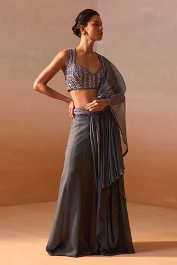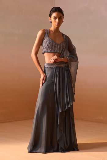 Grey shimmer georgette pre-draped saree skirt with an organza palla. Paired with a gunmetal embroidered halter blouse.