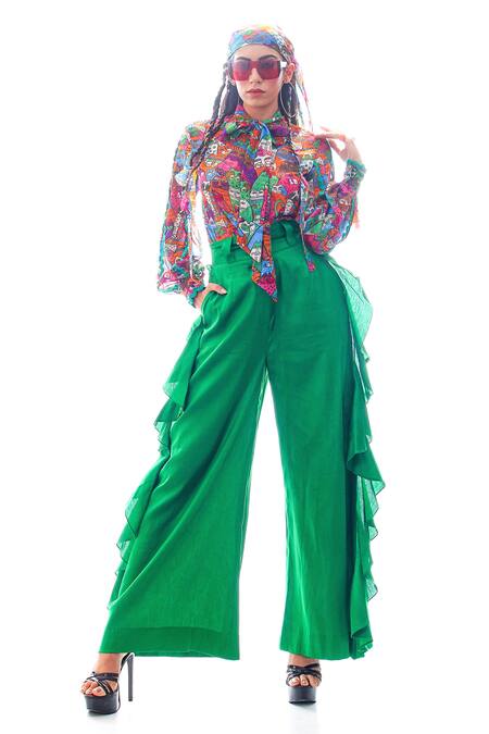Buy_Nitya Bajaj_Green Georgette Printed Cat Motifs High Meow Shirt And Ruffle Pant Set _Online_at_Aza_Fashions