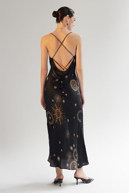 Thigh-high slit for added allure, Criss-cross tie-up back for adjustable fit, Starstruck print adds a unique touch