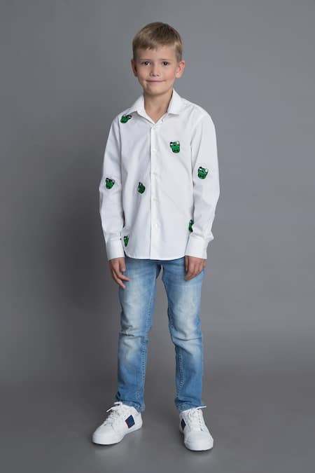 White slim fit shirt featuring frog embroidered motifs and a front button placket