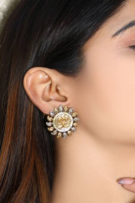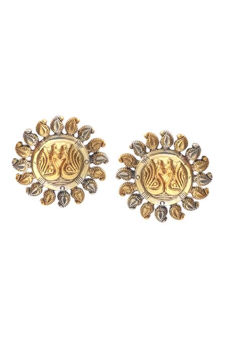 Dual toned stud earrings featuring intricate bird and paisley carved detailing