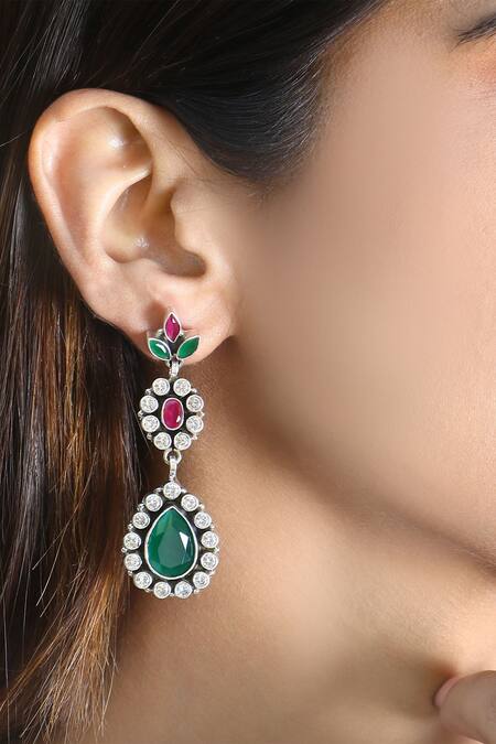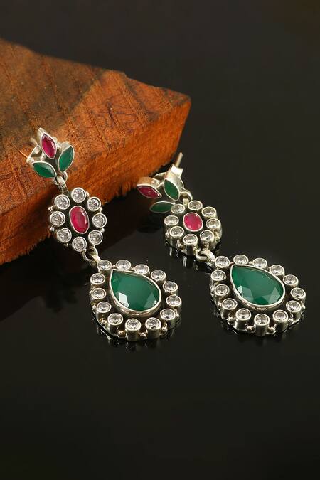 Silver tear drop shaped earrings featuring green and white stone embellishments