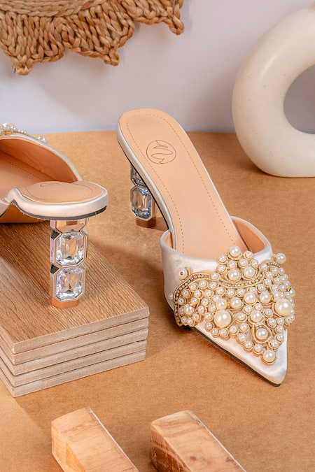 Intricate pearl embellishments on the upper., Block heel with clear crystal accents., Pointed toe design for a sleek look.