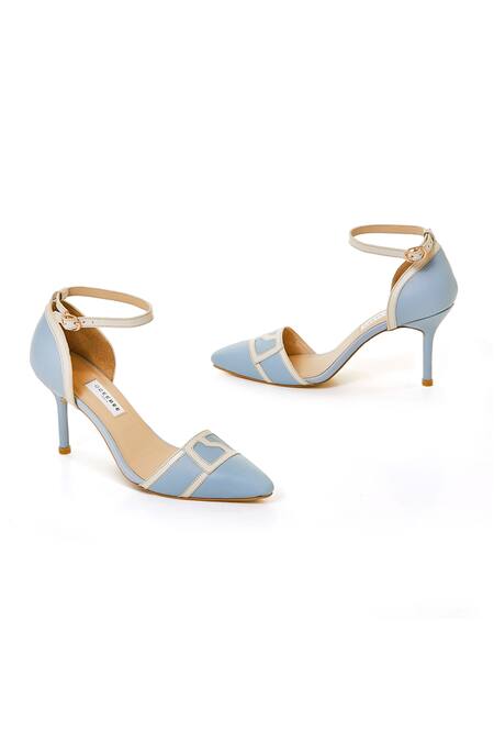 Powder blue, ivory pointed toe stilettos with adjustable ankle buckle strap.