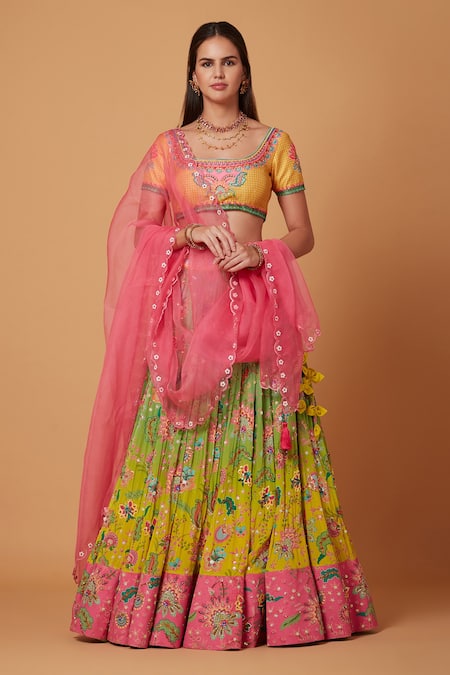 Yellow & green ombre effect lehenga featuring multi-colored floral embroidery with sequin and bead work. Paired with a yellow blouse embellished with sequins and beads, and an organza dupatta.