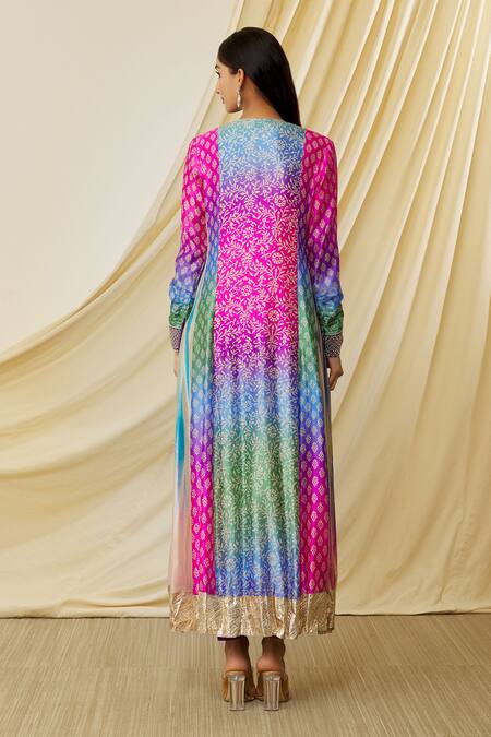Multi color ombre silk anarkali with pleated flare, notched round neck, multi panel floral, butti, animal stripe print, gathered full sleeves, sequin, zari & bead hand embroidered yoke. Paired with pants & floral print dupatta.
