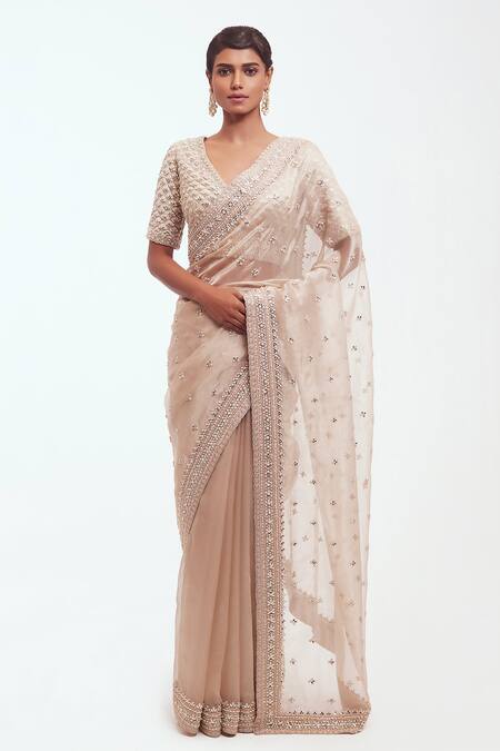 Gold Tissue Embellished Mirror V Neck Saree And Blouse Set