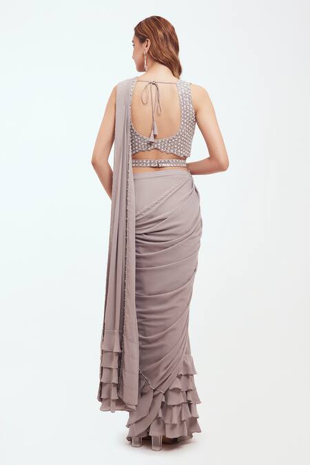 Grey pre-draped saree in georgette featuring tikki and moti embroidered edges on the pallu. Comes with a sleeveless blouse and a matching belt.
