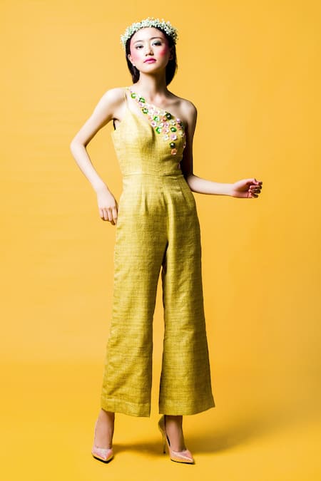 Green Thin Jute Silk 3d Floral Applique One Shoulder Embroidered Jumpsuit