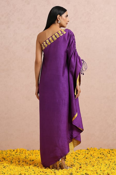 Plum madras silk dress with one side gathered batwing sleeve, sequin & bead hand embroidered one shoulder neck.