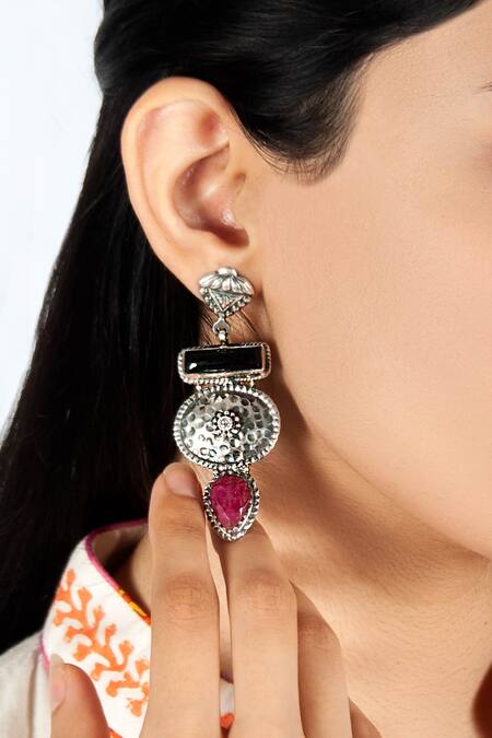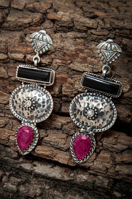 Silver Plated Ruby, Onyx Embellished Carved Earrings