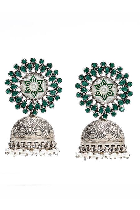 925 sterling silver meenakari jhumkas with green onyx gemstone embellishments.