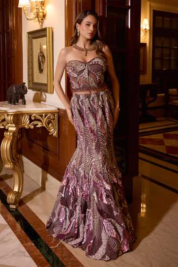 Lehenga set combining Indian and Western design elements.