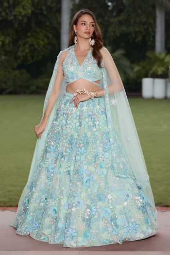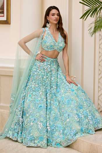 Aqua Polyester, Mesh V-neck Florence Embroidered Lehenga Set