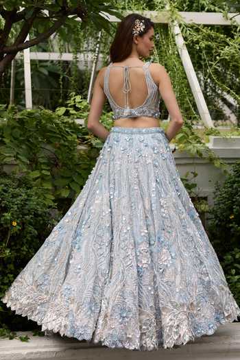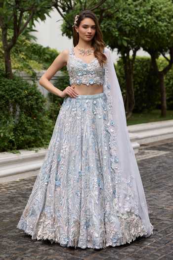 Powder blue lehenga set with 3D floral applique and hand-sculpted petals, showcasing couture craftsmanship. Paired with a matching blouse and dupatta.
