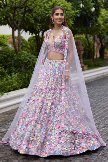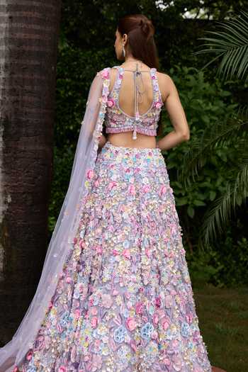 Lavender multicolour lehenga set featuring three-dimensional floral embroidery with hand-sculpted petals, pearls and sequins. The couture lehenga is crafted in a serene lavender hue and showcases nature-inspired detailing.