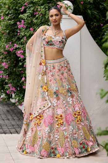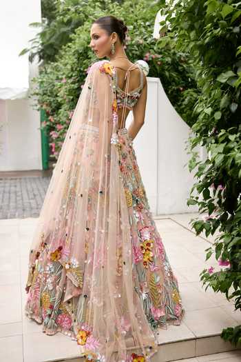 Peach multicolour lehenga set adorned with 3D floral embroidery, shimmering sequins and delicate pearls. Includes a fitted embroidered blouse and a sheer embroidered dupatta.