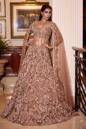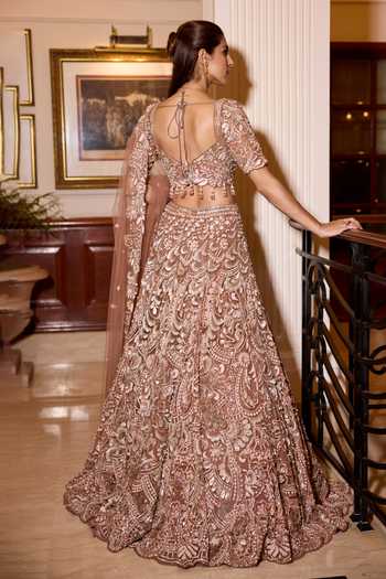 Dark peach, brown lehenga set blurs the line between art and attire and is a poetic ode to nature's delicate expressions. Draped in a serene mauve shade, the ensemble features three-dimensional floral embroidery that mimics blossoms in full bloom.