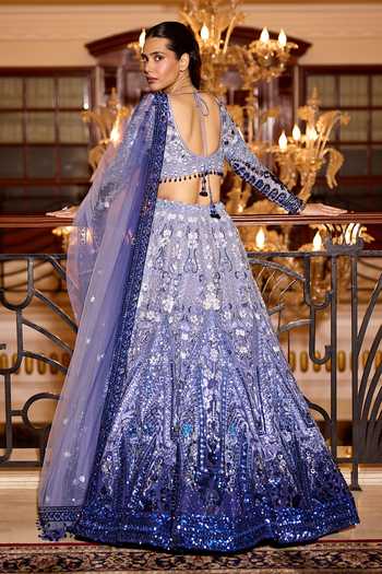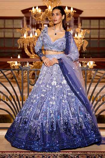 Blue ombre Aster lehenga set is a celebration of quiet grandeur and contemporary craftsmanship. It begins in a deep, stormy cobalt at the hem and melts into a luminous, airy powder blue near the waistband, creating a breathtaking ombre.