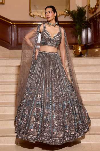 Grey, silver, blue lehenga set features hand-embroidered floral motifs reminiscent of wisteria, set on a smokey canvas. The set pairs an embroidered lehenga with a matching blouse and dupatta.