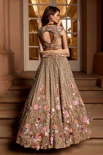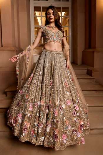 Gold multicolour lehenga set featuring 3D hand-embroidered floral motifs in blush, dusty rose and ivory tones. The set includes a matching embroidered blouse and a sheer dupatta with coordinating floral accents.