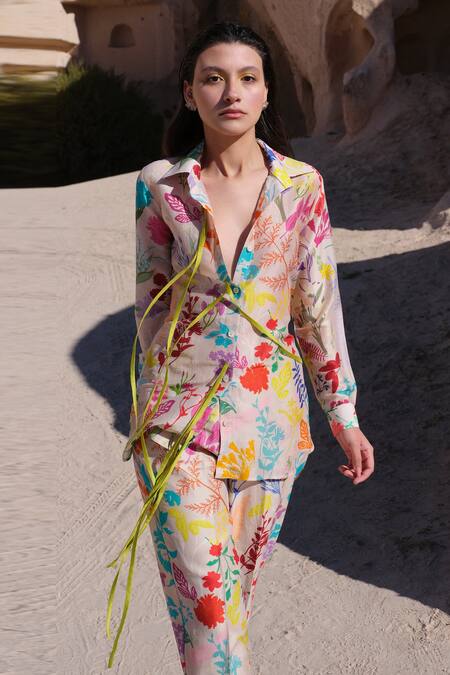 Multicolor shirt with garden print. Paired with pant.