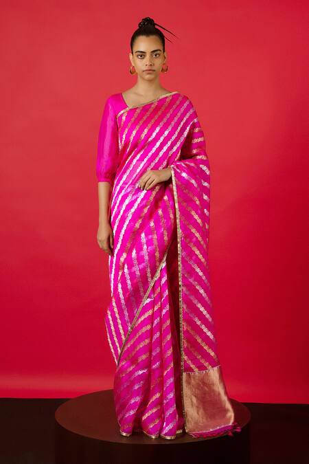 Pink saree in organza featuring handwoven floral diagonal patterns in gold and silver thread work. Comes with unstitched blouse fabric in matching color.