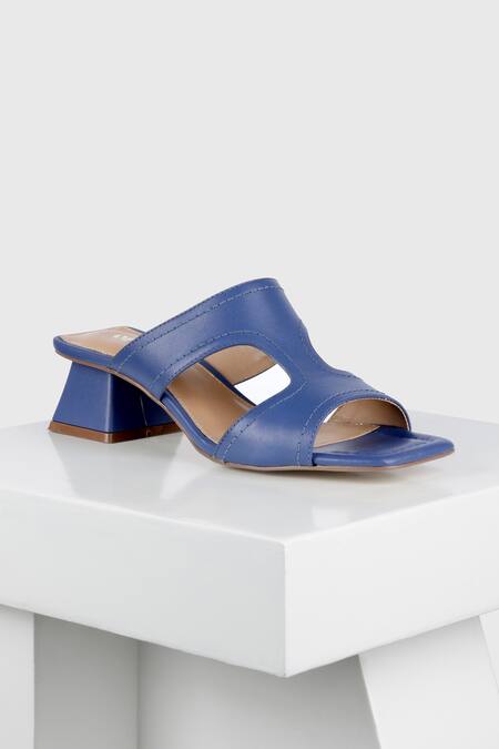 Blue sandal featuring stitchline embroidered border, cutwork on straps, and square front detailing