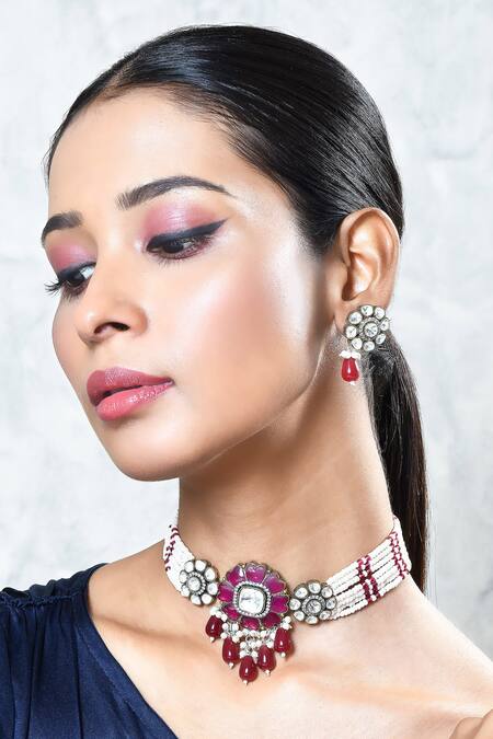 White and pink multi-layered pearl choker set featuring a center kundan pendant adorned with ruby semi-precious stones. Accompanied by a pair of kundan drop earrings.