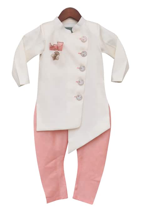 Off white kurta featuring patchwork bead embroidery and a Mandarin collar. Paired with peach elasticated waist pants.