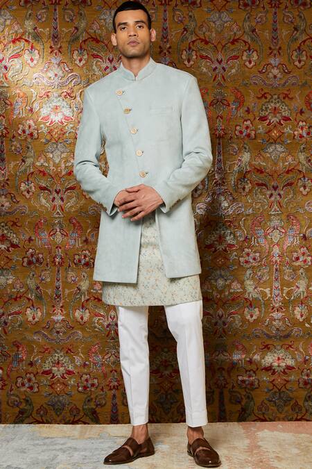 Aqua blue sherwani with diagonal front buttons paired with printed short kurta. This set comes with plain straight pants.
