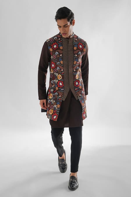 Brown bundi featuring mandarin collar and floral thread embroidery. Paired with a striped kurta and black cotton pant.